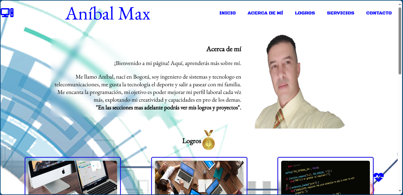 In this first attempt, I wanted to create my web portfolio, with the goal of showing my achievements and skills, which I implement in an orderly and creative way using some of the tools I know, such as HTML, JavaScript, CSS, Git and Github, to achieve this result.