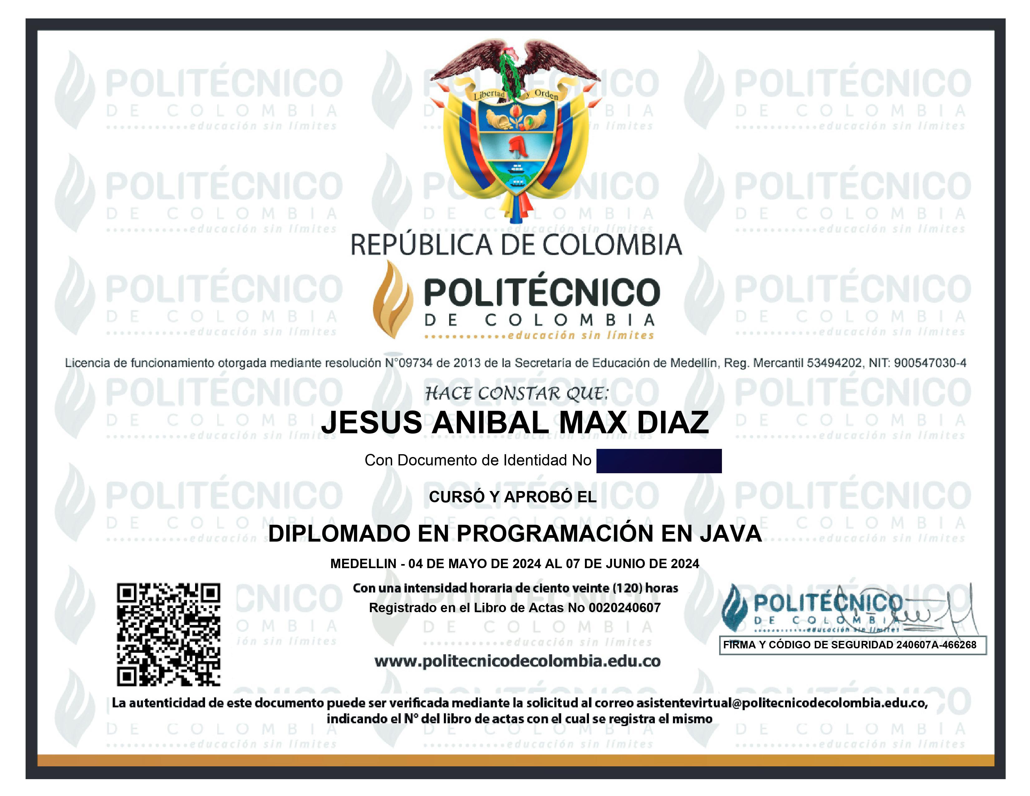 By earning my diploma in Java, I learned how to develop code efficiently and apply object-oriented programming principles, which has significantly improved my technical skills and ability to develop programs.