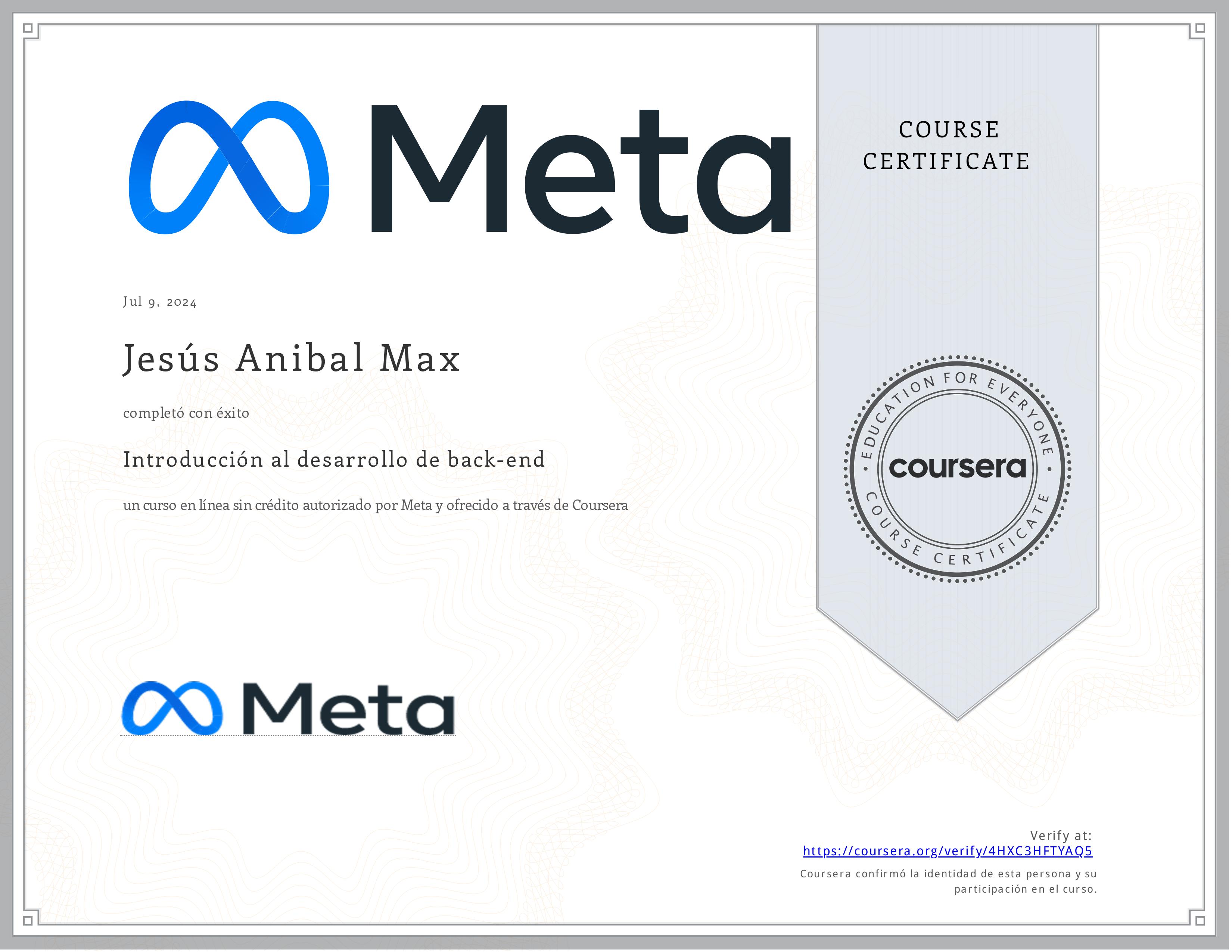 Earning my Meta certification as a backend developer allowed me to master Python, Git, and gitHub. I learned how to create web pg, and how to implement version control, which prepared me for real challenges in web development.