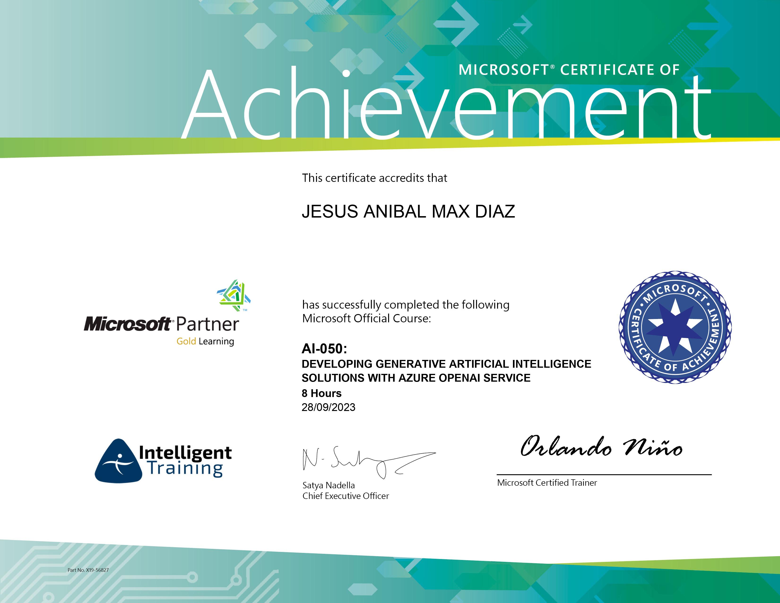 By earning my AI-050 certificate, I learned how to implement natural language processing solutions using OpenAI models on Azure, improving my skills in artificial intelligence and expanding my knowledge in cognitive services and machine learning.