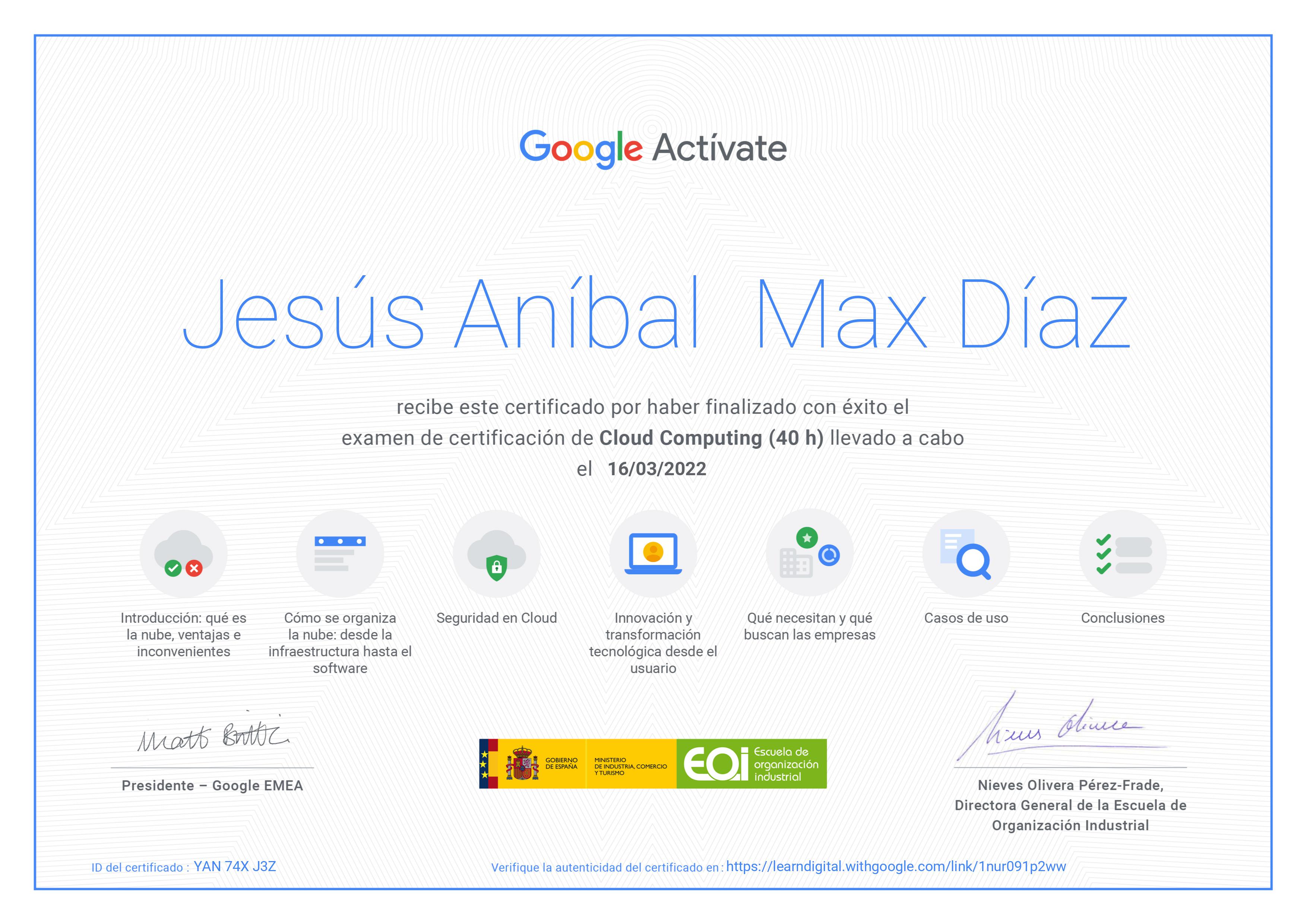 Obtaining my certificate in cloud computing allowed me to master the management of cloud services, optimize resources and secure data. I learned to implement scalable and efficient solutions, improving my ability to innovate in technological projects.