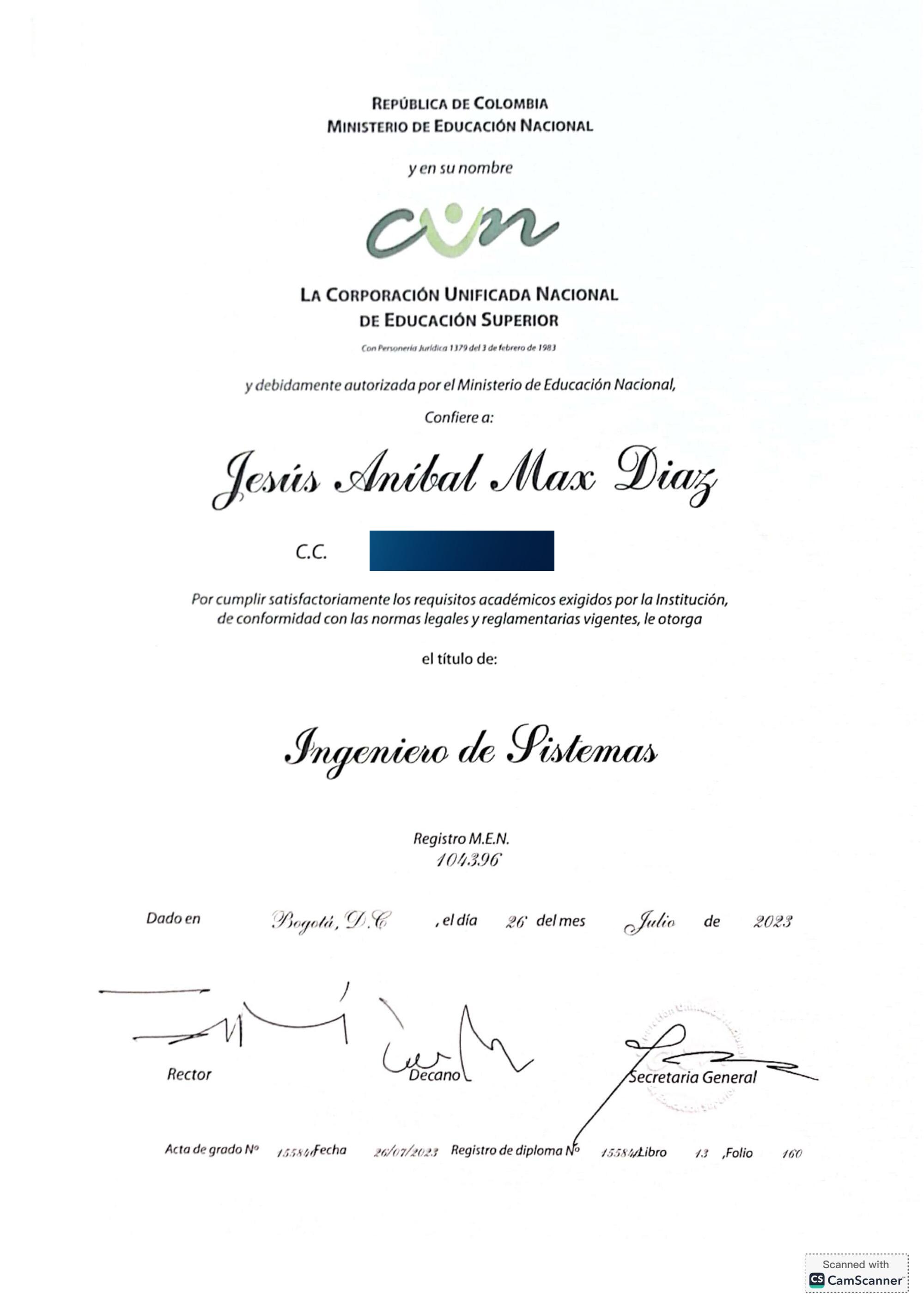 My name is Aníbal, I was born in Bogotá. I am a systems engineer, Telecommunications technologist and web developer, I love technology and sports and travel with my family and friends. I'd love to learn more about IA to be able to improve my job profile by exploiting my creativity and capacities for the benefit of others.