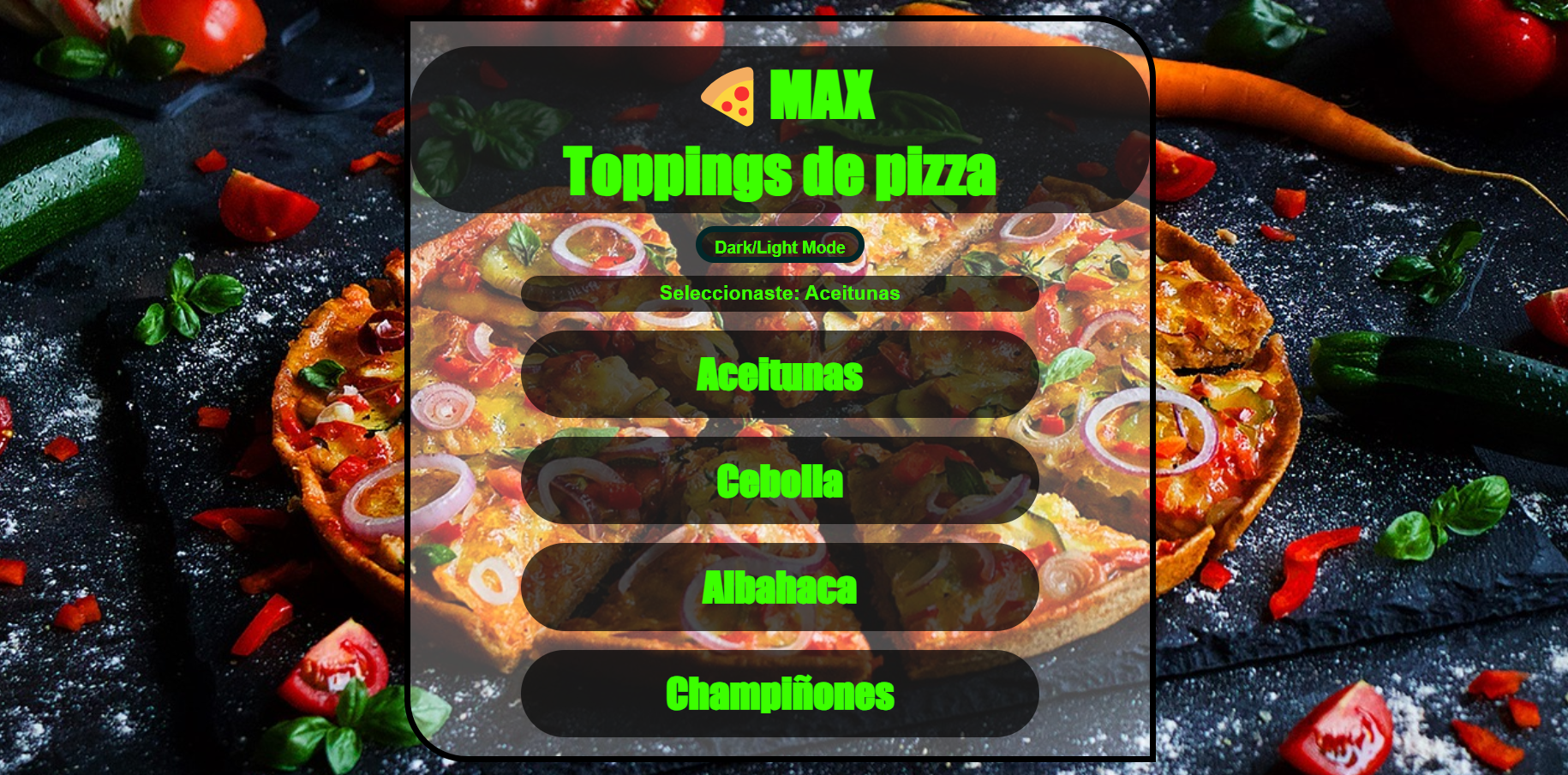 Here you can see an example of an app for adding the toppings you want for a pizza from a list of options. Additionally, you can switch the view mode from light mode to dark mode and vice versa by simply pressing a button, using a bit of JavaScript.
